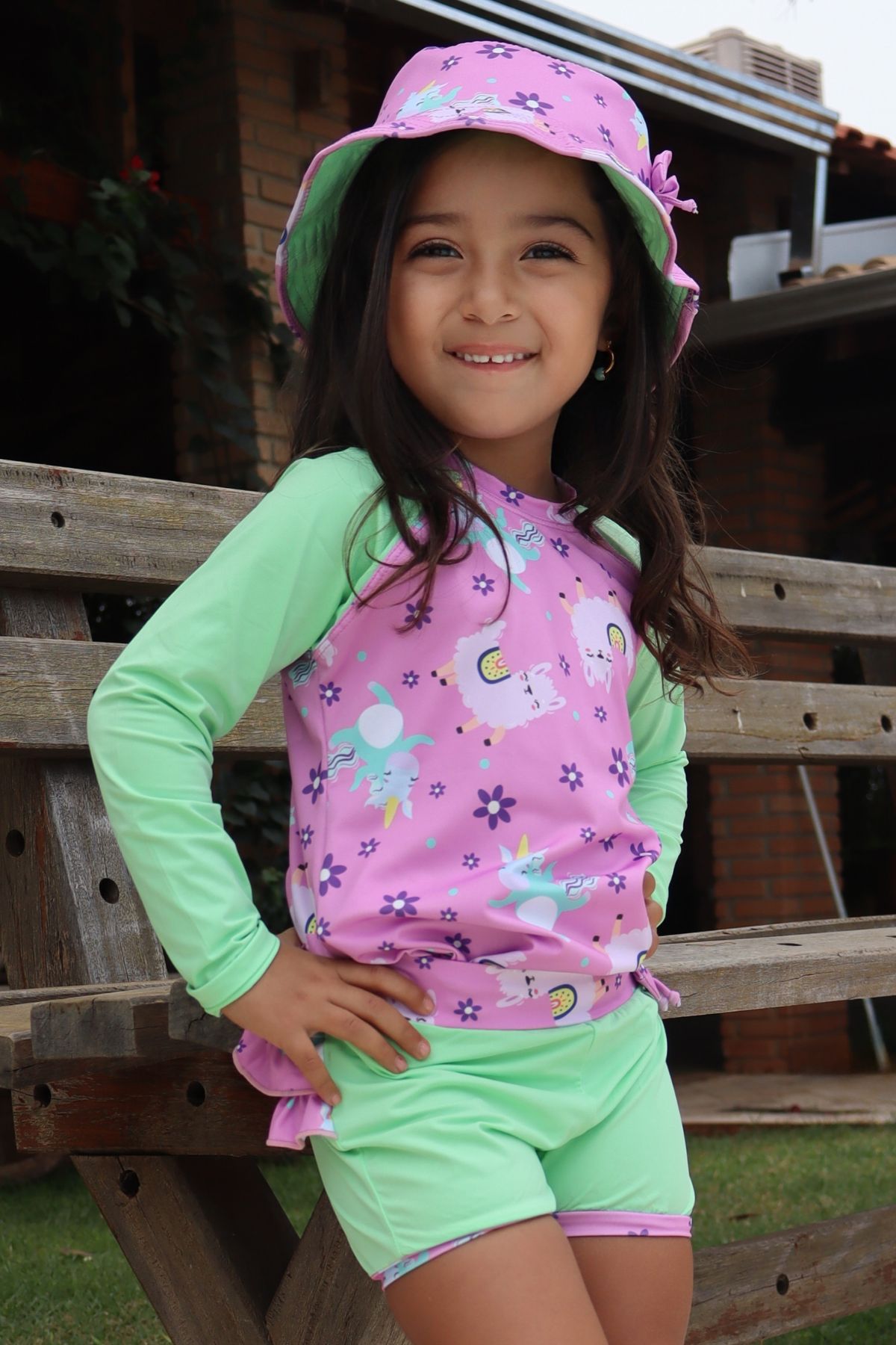Conjunto proteção bebe com camiseta de manga longa, sunga box e chapéu de proteção pespontado na aba.