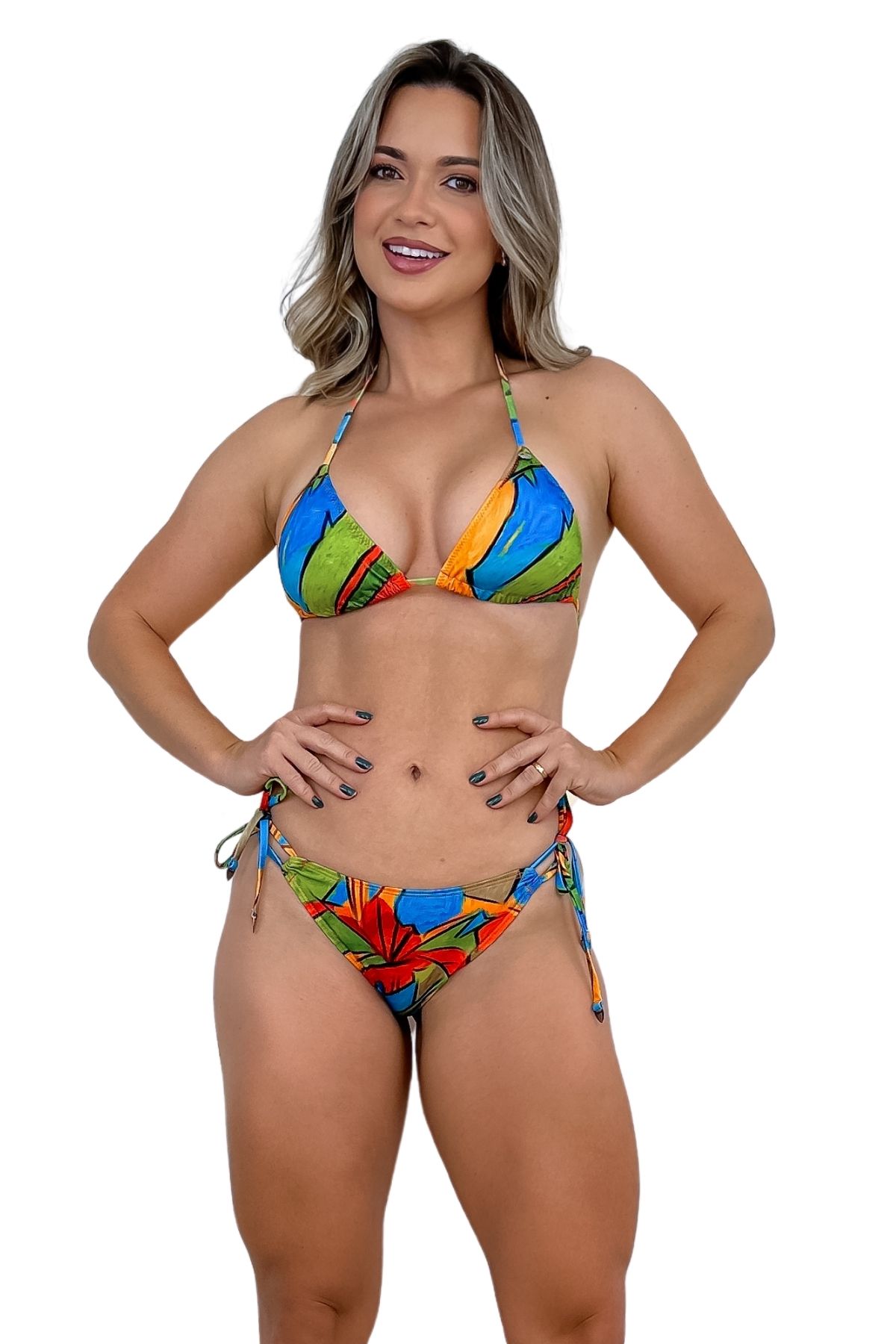 Este biquíni lacinho possui modelagem tanga, com laterais em tiras finas para amarração e cobertura média.